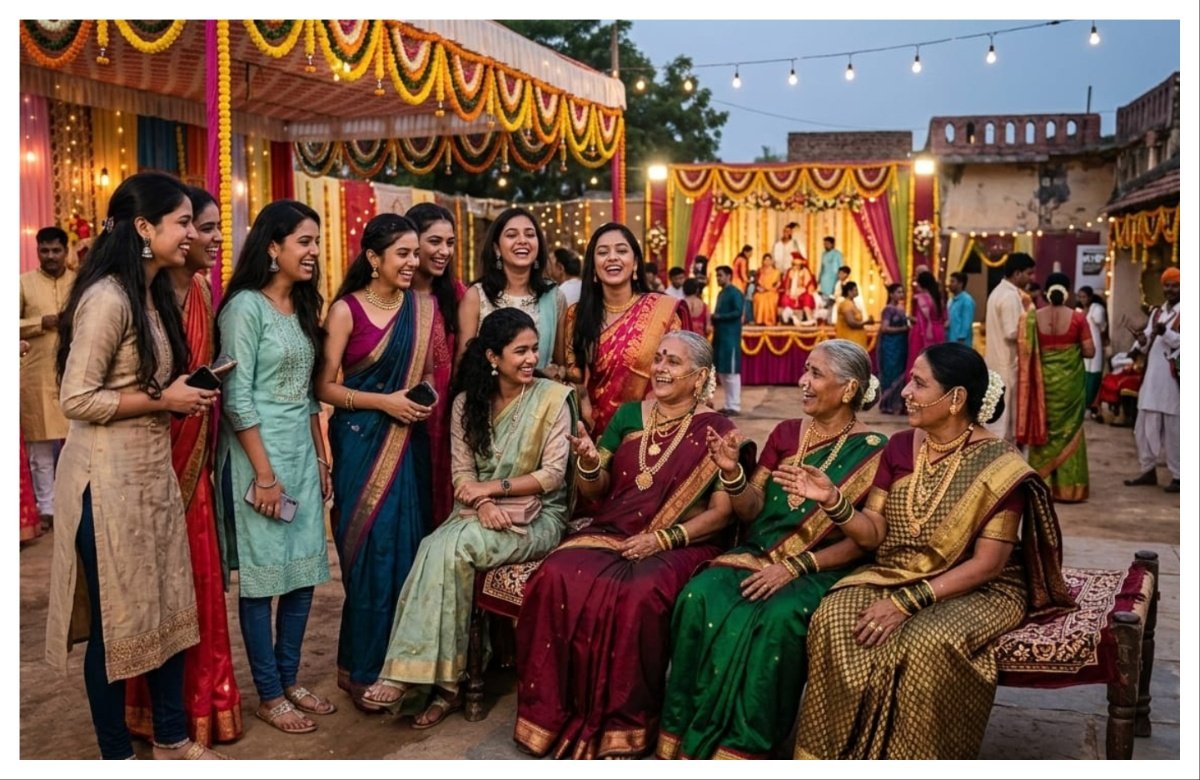 नवऱ्या मुलीबरोबर तिच्या मैत्रिणी तसेच इतर मुलींना आजी सगळ्या विधींबद्दल माहिती देत, गप्पा मारत काम करत होत्या. नवरी मुलगी कॅालेजमध्ये शिकायला शहरात काही दिवस होती, त्यामुळे तिच्या तेथील मैत्रिणी पण लग्नाला आल्या होत्या. एकूणच तेथील सगळा कार्यक्रम त्यांना गोंधळच वाटत होता. त्यामुळे त्या सारख्याच त्या कार्यक्रमांना, दागिन्यांना, पेहेरावाला नावे ठेवत होत्या. गावातील सर्व आजी त्या मुलींसाठी फक्त हसण्याचा विषय होता…